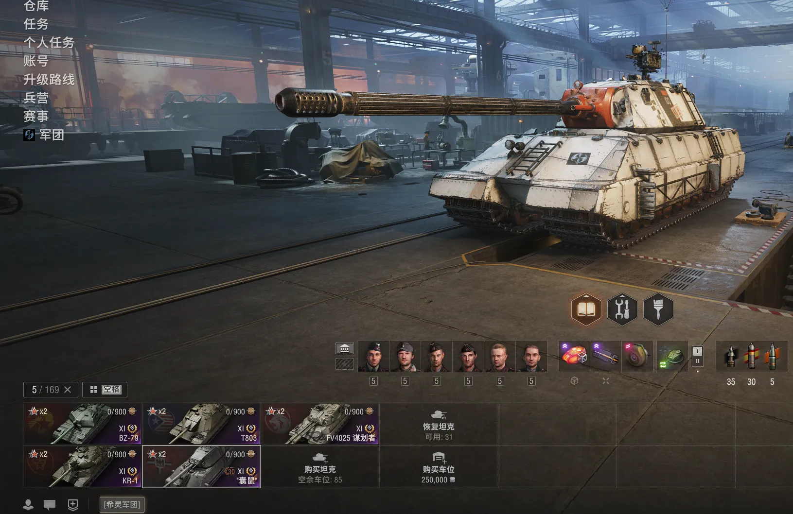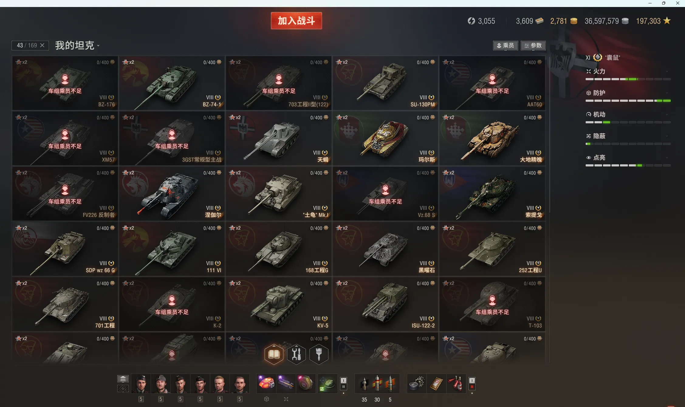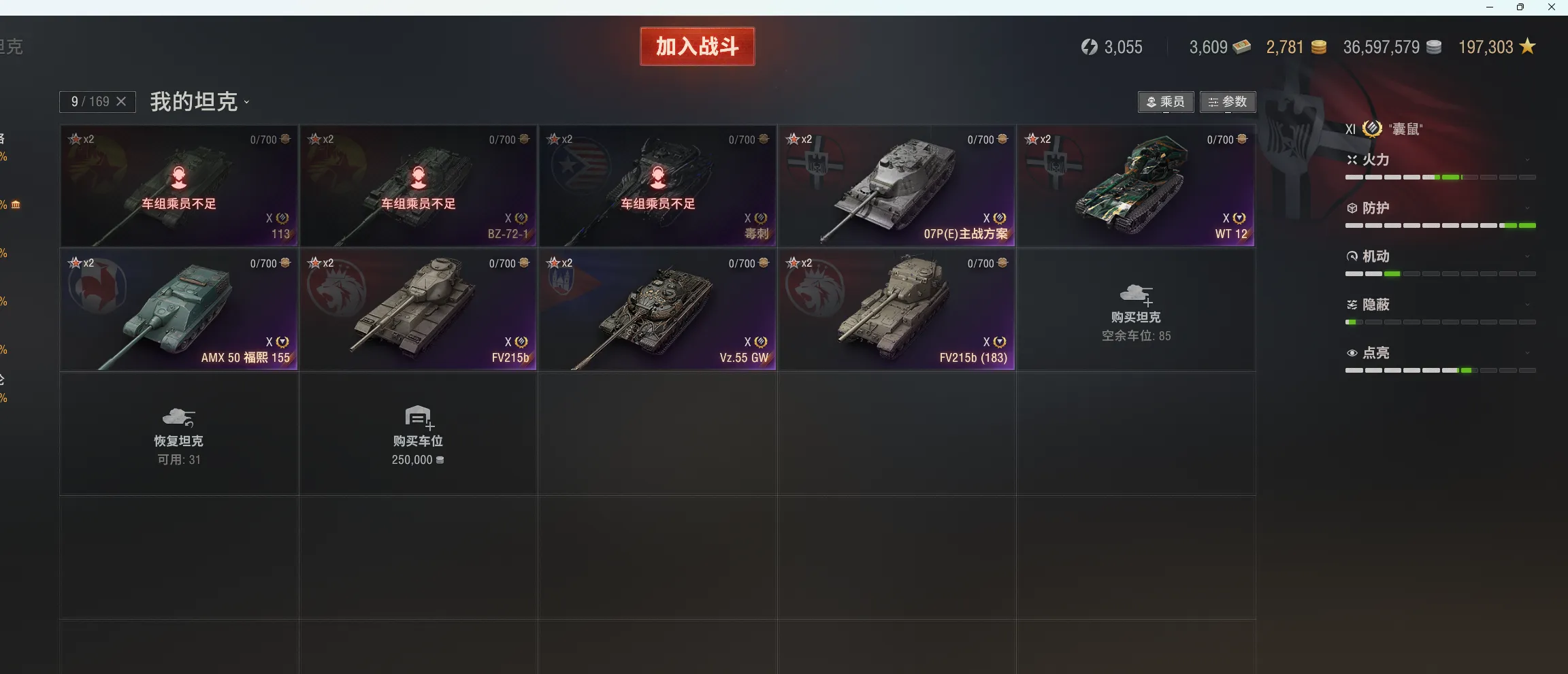 11级5台:BZ-79,T803,囊鼠,KR-1,爆裂者等。10级47台:白云,哥特,07pe,毒刺,bz-72-1,183,113, 伏羲155,121b等。9金22台:cc-46p,缪拉,维钦托利,金牛座,埃里希,TS-6,DZT-159,兰博,SU122V,H3,E77,752,熊,E77,眼镜蛇等。8金43台:BZ-176,BZ-74-1 ,XM57等等。