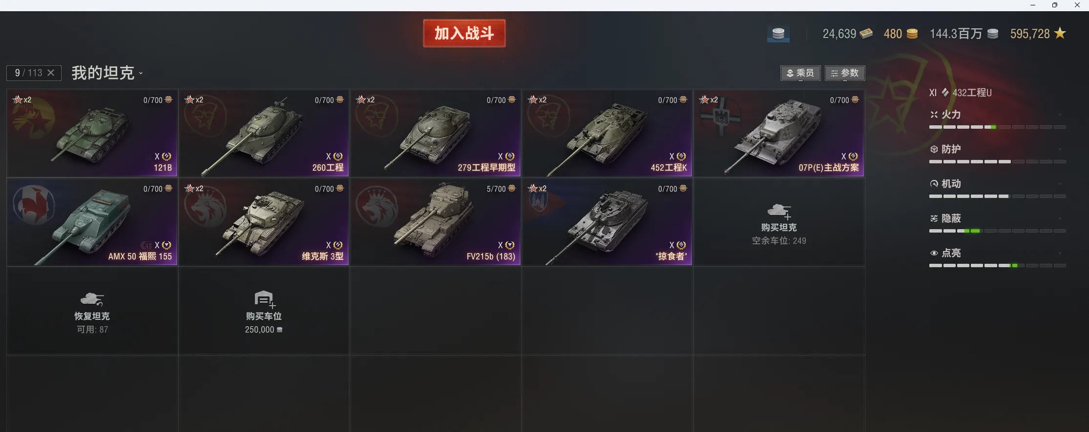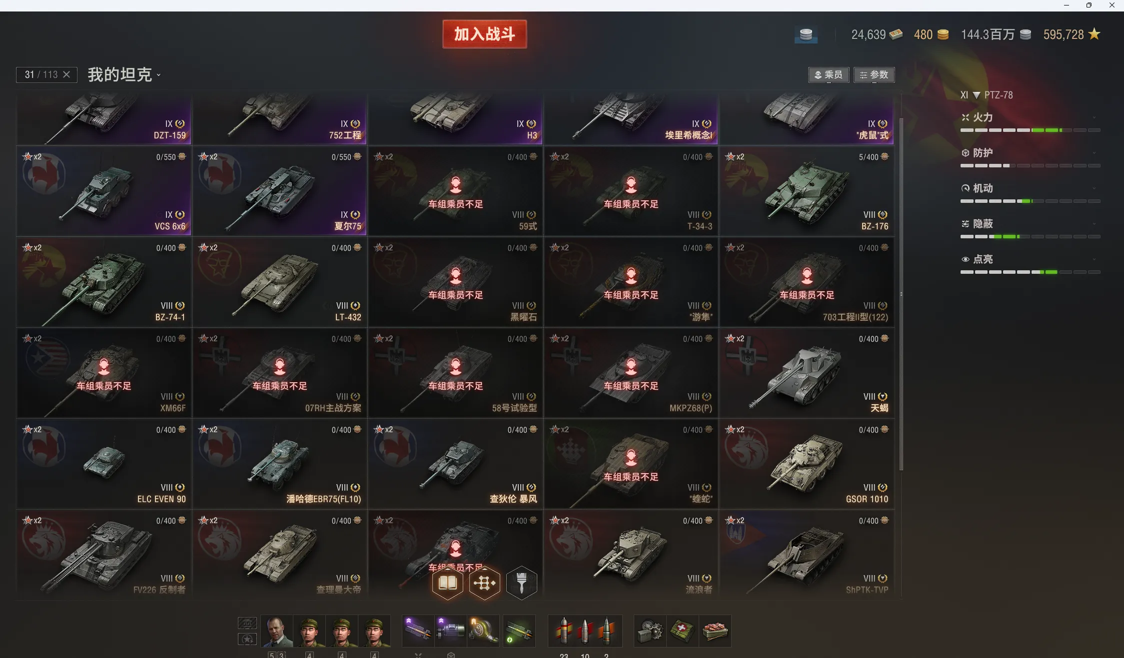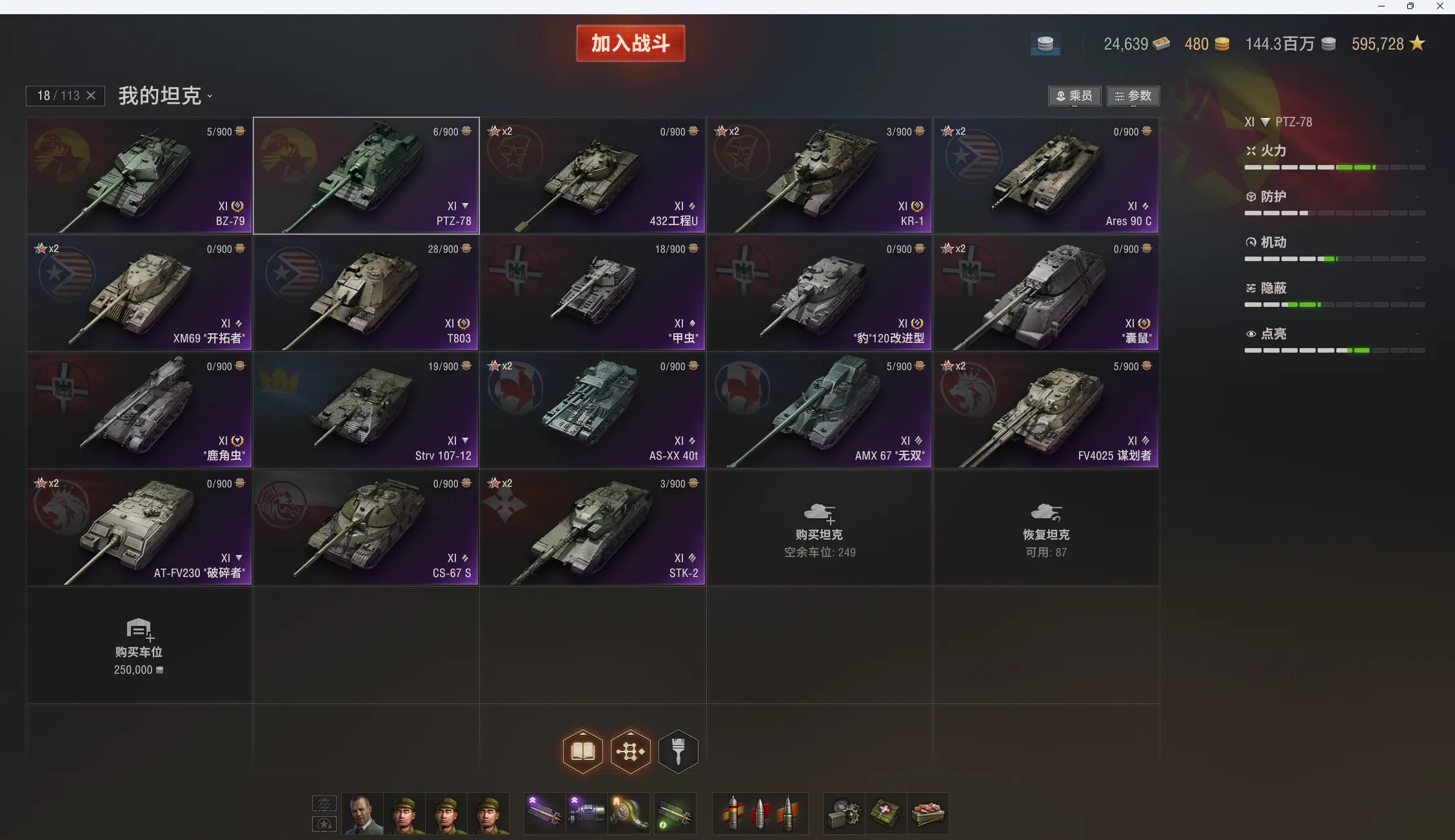 11级18台:Ares90c,STK-2,PTZ-78,BZ-79,KR-1,T803,豹120,鹿角虫,ASXX-40,谋划者,CS-67,432u,XM69,甲虫,囊鼠,strv-107,AMX67无双,破碎者。10级在库57台。10金:掠食者,279,编号452k,铲子豹,维克斯,260,183,121b等。9-8金31台:DZT-159,埃里希,H3,752 ,虎鼠,BZ-176。查理曼大帝,BZ-74-1等。