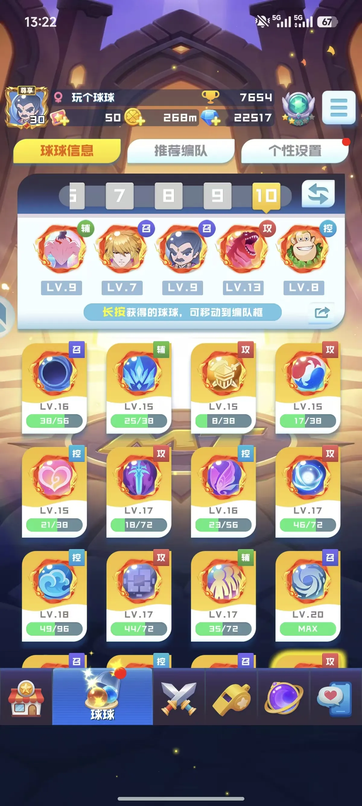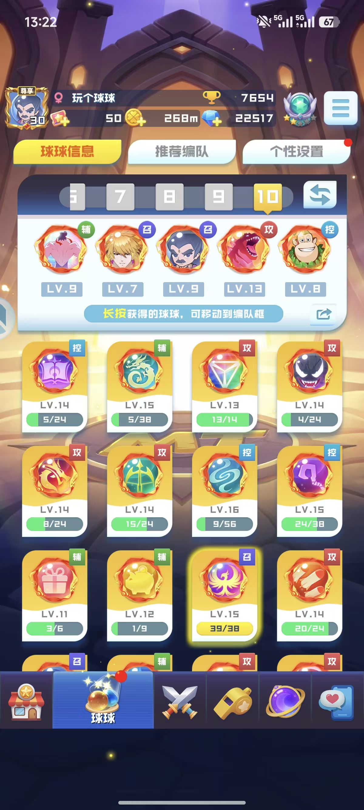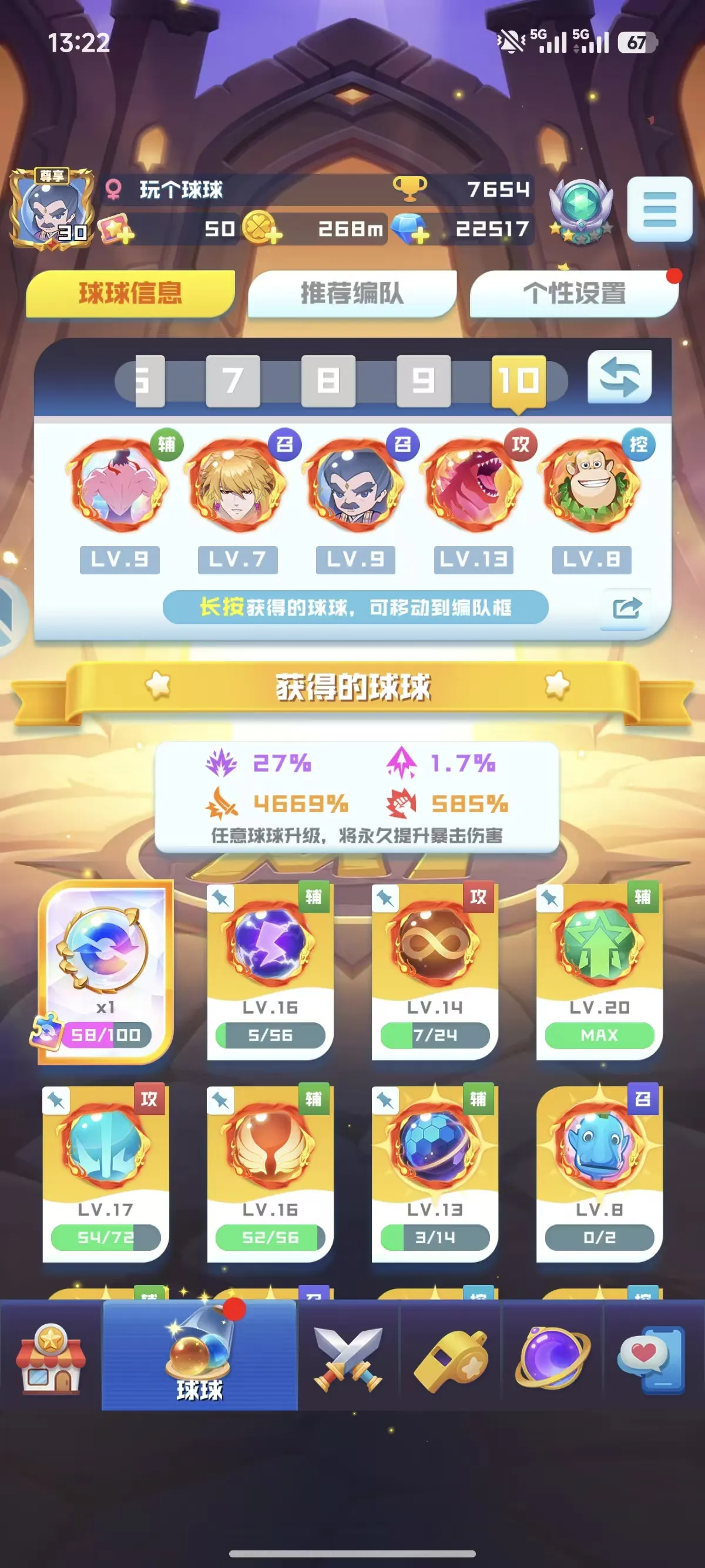 官服:14无限16魔力13盾9轮子17圣光16天使 4669%爆9阵,大部分的联动球球都有